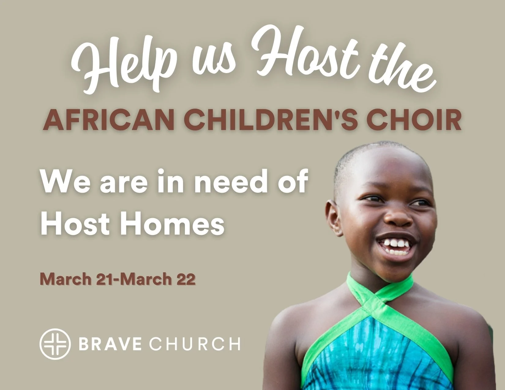 We’re honored to welcome the African Children’s Choir to Brave Church and are looking for host homes to care for the children and their chaperones during their visit. Hosting is a meaningful way to extend hospitality, provide rest and encouragement, and be part of what God is doing through their ministry.