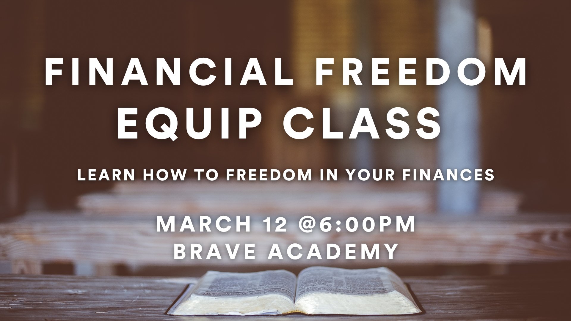 That’s why we created this 2-hour Equip class on Financial Freedom. This class is designed to help you practically begin or improve your journey toward clarity and peace with your finances. We believe God provides wisdom and insight through His Word about how to handle money in a way that leads to freedom rather than fear, and we’ll use Scripture as a guide alongside practical tools and conversations.